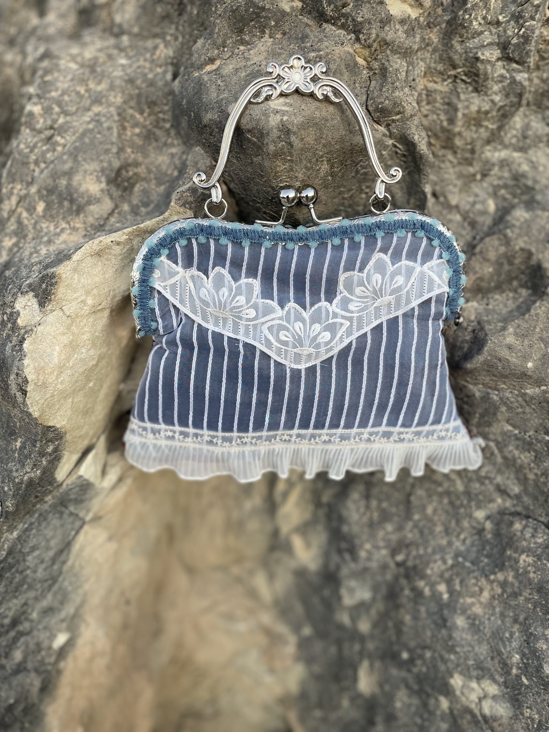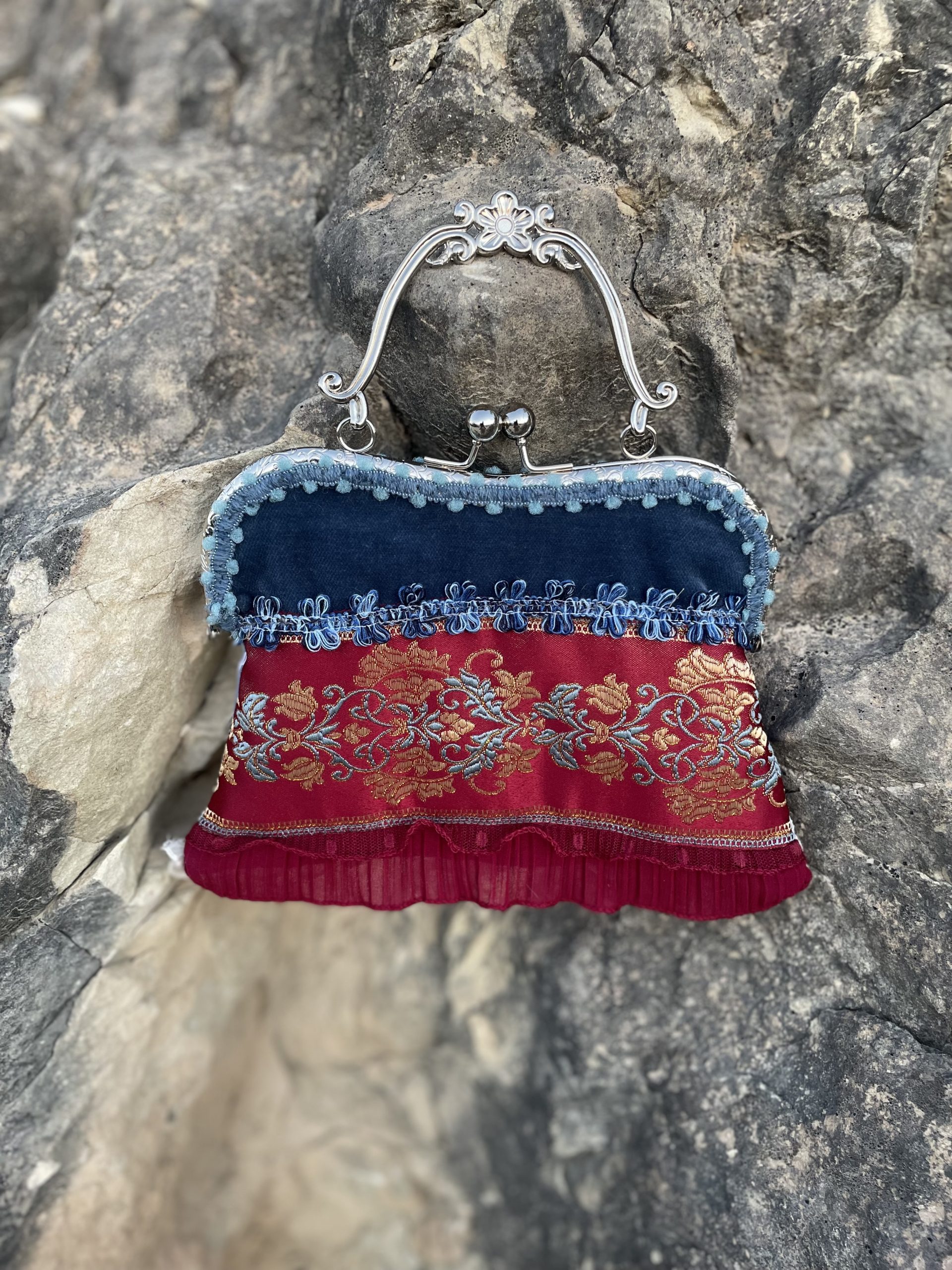 Bolso hecho a mano, con tejidos y pasamanería exclusivos.